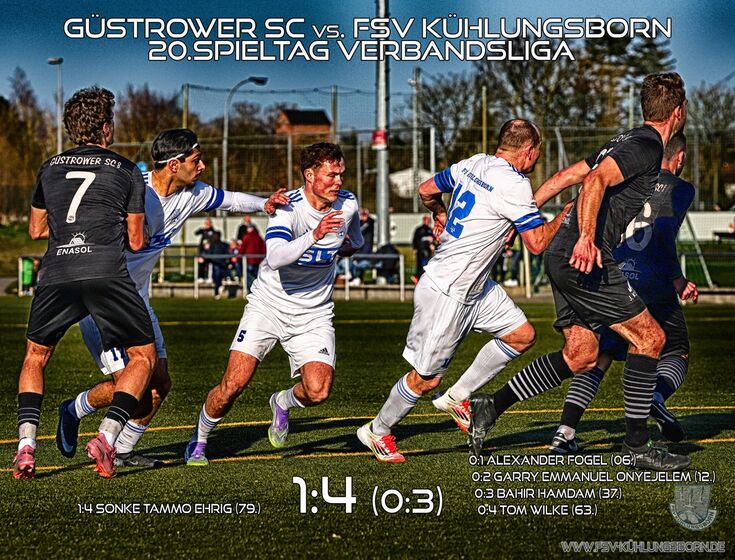 AUSWÄRTSSIEG! Mit einem hochverdienten 1:4 fährt unsere Erste weitere drei wichtige Punkte ein! Dabei waren durchaus noch weiter Treffer möglich; mehrfach wurde aus besten Positionen das Leder nicht im Tor untergebracht. Die Treffer für den FSV Kühlungsborn erzielten Alexander Fogel, Garry, Bahir Hamdam und Tom Wilke! Damit bleibt der FSV weiter im oberen Tabellendrittel! Leider musste Lucas Leutert bereits zu Spielbeginn nach einem Luftzweikampf mit Verletzung im Kieferbereich vom Feld und sich in der Uni-Klinik behandeln lassen.. Wir wünschen natürlich beste Genesungswünsche!